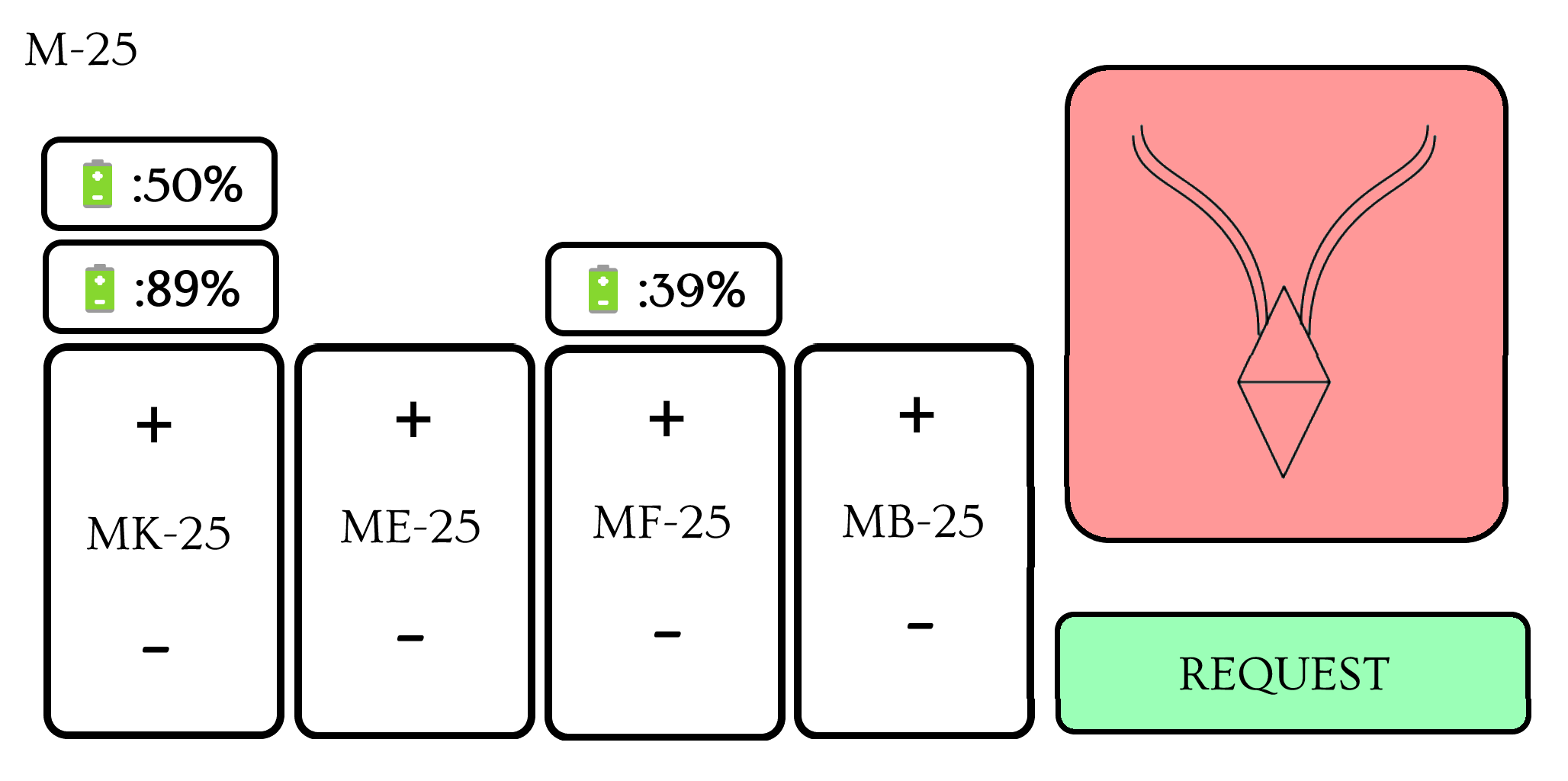 Dynamic Flock Management: Each drone class—MK-25 (Tanker), ME-25 (Electronics), MF-25 (Fighter), and MB-25 (Bomber)—is represented by its own column. The pilot can instantly request new assets to be deployed (+) or dismiss active drones from the formation (-) with a simple touch. As a critical safety measure, all deployment changes must be finalized with the 'REQUEST' button, preventing accidental commands during high-stakes manoeuvres.